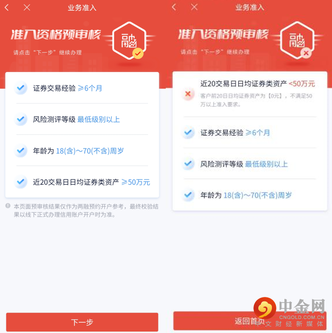 校验您是否具有两融开户资质:若您满足基本准入条件方可进行下一步;若不符合,则会展示原因。