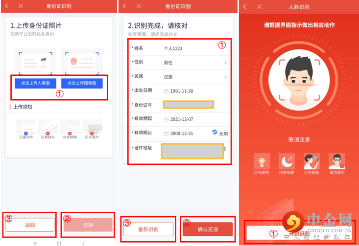 请您上传身份证照片,点击识别后对页面信息进行核对;确认无误后进入下一页面进行人脸识别。