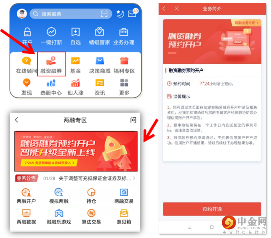蜻蜓点金APP首页-融资融券-进入两融专区,点击上方轮播图进入“融资融券预约开户”页面。