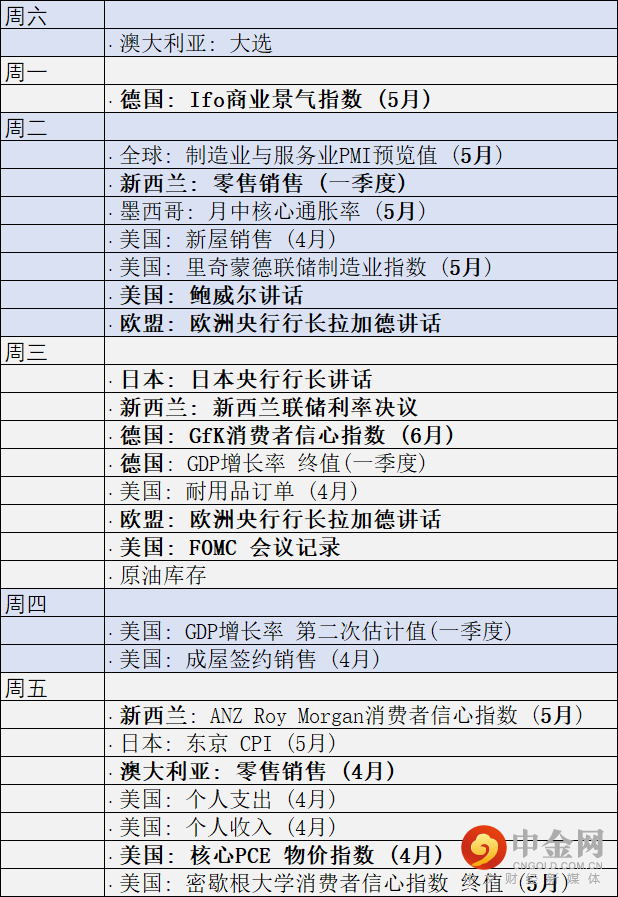新西兰联储周三利率决议可能是当周央行事件的核心,它是否一如期待加息50个基点?5月制造业与服务业数据也将遭到审视,观察经济增长是否放缓的信号。另外,财报也不容忽视。Target和沃尔玛上周严重差于预期的业绩报告,使得市场关注着Big Lots和Dollar General等折扣零售商本周将要发布的财报。