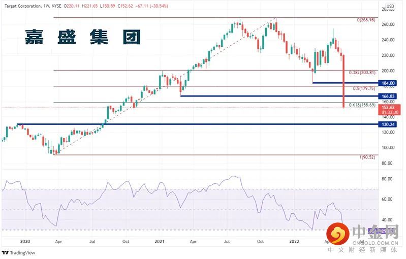 Target上周发布的财报令人失望,股价随后暴跌,当周跌幅高达30%左右,不仅击穿了2020年3月疫情期间低点到2021年11月高点行情的38.2%回档位,还攻克了同期行情的50%和61.8%,下破158.69。下方无支撑,直到130.24的水平支撑位,如果攻破,可能势如破竹跌至2020年3月低点90.52。不出意外,RSI处于超卖区域。这一般暗示股价或准备反弹,但在股价瀑布式下跌时这个指标不够可靠。如果股价确实实现反弹,则上档阻力分别有周图的水平阻力位166.83和184.00。