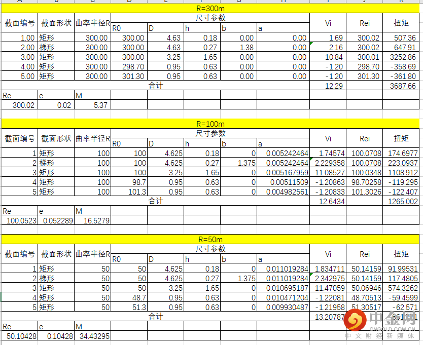为了验证上面的结论,我又用Civil建了半径为∞(直桥)、300m、100m、50m的模型进行试算。3*30m等截面连续箱梁,只考虑自重和靠曲线外侧的一个偏载车道荷载,所有模型只有曲率半径不同,其他参数均相同。