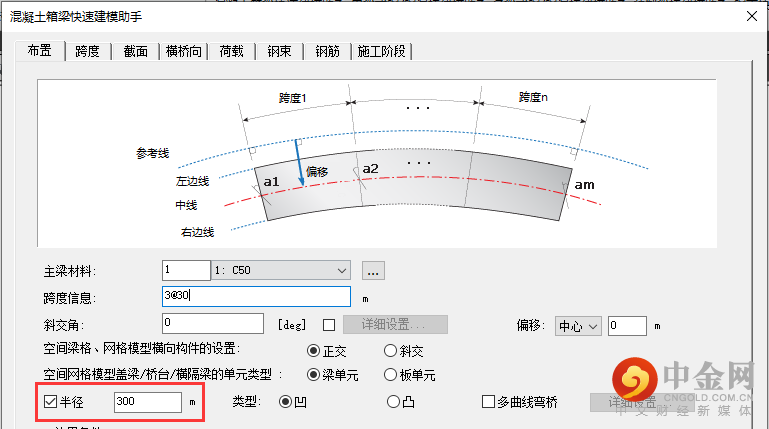 这里顺便和大家安利一下“混凝土箱梁快速建模助手”,可能大家只有梁格模型才会用建模助手,其实用这个助手建立单梁模型也十分方便,这几个不同半径的模型其实只用修改建模助手中半径这一个参数就可以了,自重、移动荷载等都可以通过建模助手直接添加。