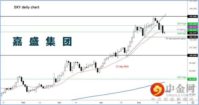 美元指数极可能收低,中断6周连涨势头。如果受制于103.21,则5月迄今月图仍为阴线。叠加月初对2017年高点103.82的突破没有守住,或构成筑顶信号。美元指数也回到2020年高点下方,即103.00之下。所以现在看来,如果受制于103.00,短线技术面趋于下行。