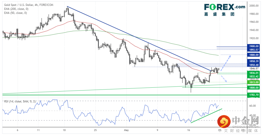 金价上周站上下破趋势线,显出努力逆转趋势的样子。对1800的突破为假性突破,随后构筑3个月低点并回到1850。RSI也在确认价格的上涨势头。金价4小时图在50期指数移动均线上方盘整,后市或最终站上1850.5和1858.4阻力,我们可能考虑在下探1836时逢低买入。上档目标包括200期指数移动均线附近的1880和1892-1900的阻力区域。但若下破1830,我们的看涨观点失效。