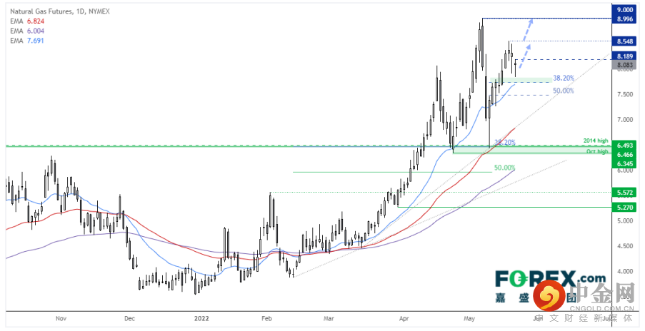 天然气价格日图依然处于强劲的上涨趋势中,周四和周五两天虽然稳定回撤,但守住了20天指数移动均线和38.2%回档位。如果站上周五高点,后市或延续上涨行情,先后上看8.548和9.00附近。
