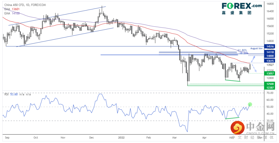上周五亚洲股市反弹,动力来自当天中国人民银行下调其5年期贷款市场报价利率15个基点。中国A50指数日图收盘价创下4周最高点,今天是否能够延续?这值得我们关注。RSI与价格形成了看涨背离,目前处于50上方的今年最高点,确认上涨动能。股指的中枢点位可能在13,615,如果站于其上,或延续上涨,后市上看14,000;但若形成看跌反转K线或收于其下,或警示新一轮跌势。