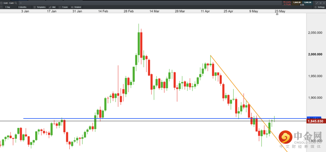 现货黄金周五震荡反复,收涨0.03%,报1846.62美元/盎司。白银冲高承压,在22附近受阻回落,收跌0.73%,报21.77美元/盎司。