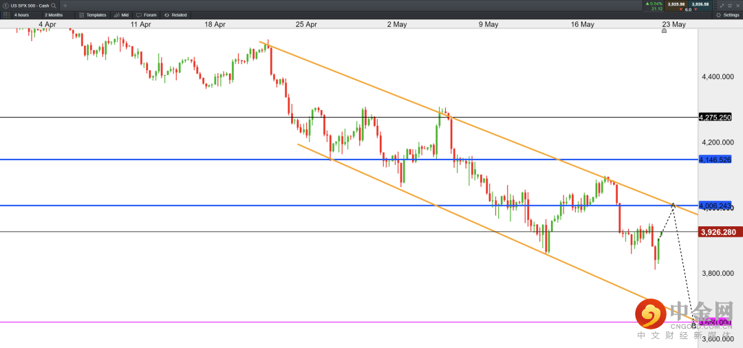 从4小时级别来看,标普500指数处于下行通道中,价格再度失守4000点整数大关,因此,短期的反弹或止步于4000附近区域并形成进一步下行趋势。预计年内低点位于3650附近。