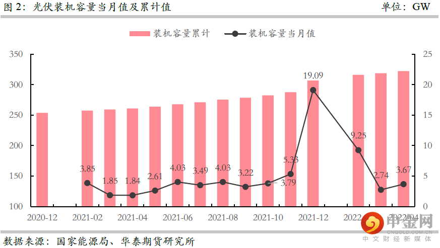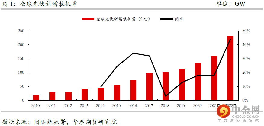 1、在全球能源转型的大背景下,叠加俄乌冲突导致的化石能源价格飙升,全球光伏装机增长迅猛。预计2022年全球光伏新增装机将达到231GW,同比增加44%。中国的光伏新增装机量更是引领全球,一季度光伏新增装机13.21GW,比去年同期增长7.88GW,同比增长148%;4月份新增装机3.67GW,同比增长110%。