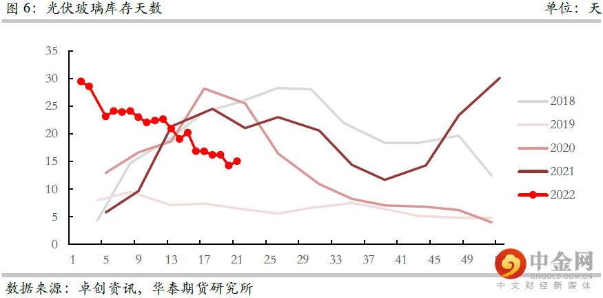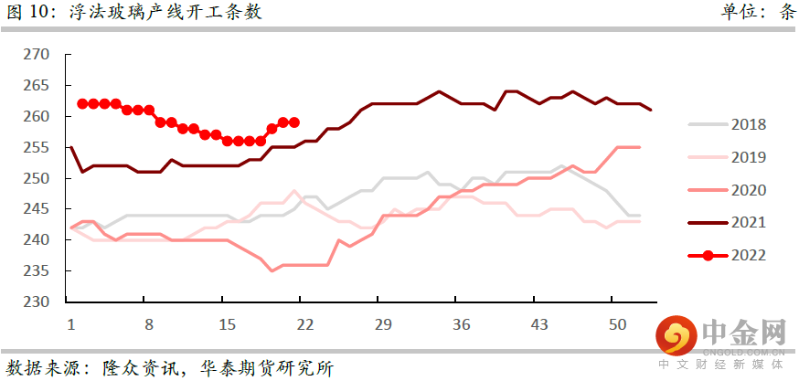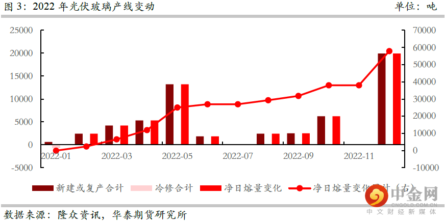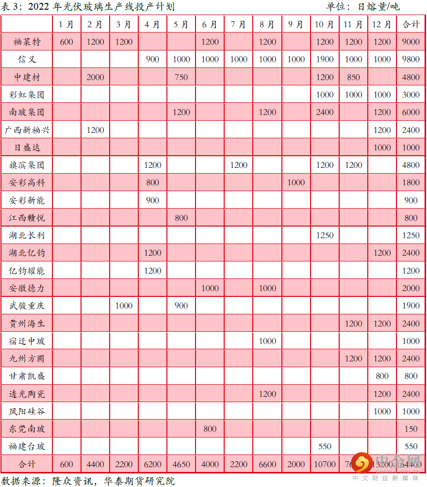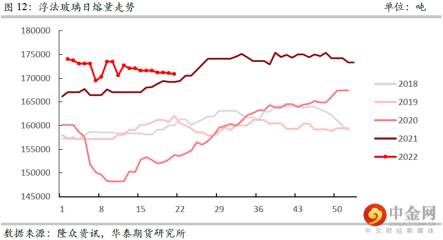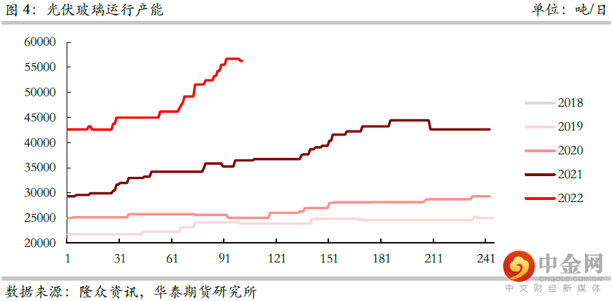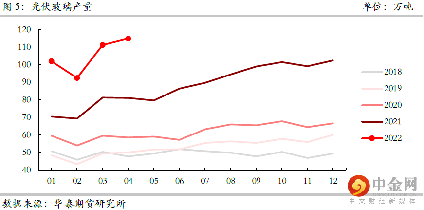 2、光伏玻璃行业相关政策松绑,叠加对光伏行业的乐观预期,使得全国光伏玻璃新增生产线大幅增加。根据华泰期货研究院的统计,2022年计划新增投产生产线24条,总计新增日熔量6.44万吨。截至4月份,2022年已投产新增产线日熔量合计1.34万吨,全国总计日熔量5.55万吨,同比去年同期提升了59%。同样光伏玻璃的产量也迅速攀升,4月份产量达114.74万吨,同比增加42%。