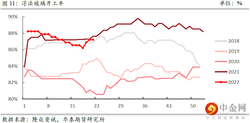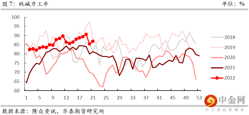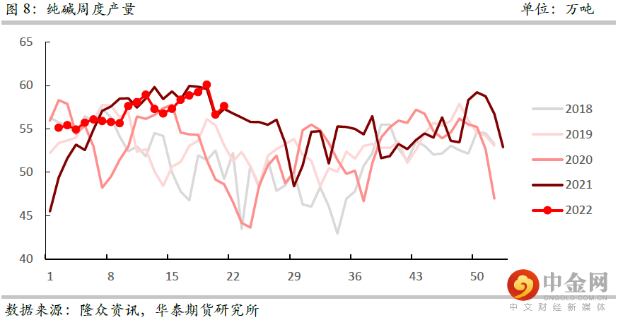 全国各地开始陆续进入夏季,纯碱的生产属于放热反应,夏季的高温会影响生产安全,另外高温也使得纯碱生产的化学反应合成率下降,此外多雨潮湿的气候也不利于纯碱的存放,因此纯碱企业通常有在夏季进行检修的惯例。数据统计显示,上周纯碱企业开工率开始出现季节性的环比下降,降至85.43%,产量也同样下降到56.64万吨/周,而在产能锁死的情况下,随着越来越多的企业开始进行夏季检修,纯碱的产量也将会出现进一步的下滑。