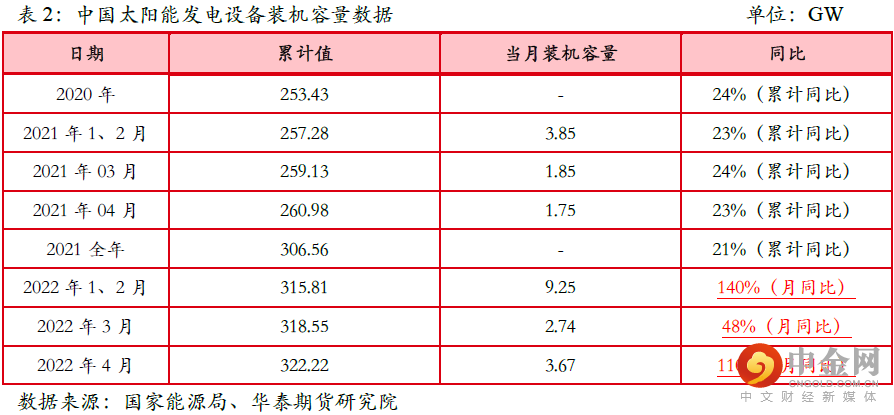 放眼国内市场,2021年10月24日国务院印发《2030年前碳达峰行动方案》,方案中明确推动能源绿色低碳转型行动,大力发展新能源,力争到2030年,风电、太阳能发电总装机容量达到1200GW以上。今年一季度光伏新增装机13.21GW,比去年同期增长7.88GW,同比增长148%;4月份新增装机3.67GW,同比增长110%,保持住了100%以上的同比增速。目前的光伏政策的落地包括整县推进、大基地、各省保障性项目、建筑光伏等,国内潜在光伏需求旺盛,预计随着硅料产能逐步释放,今年装机需求有望达到80GW。