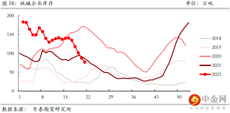 纯碱作为产量非常刚性的产品,在今年的消费端却利好不断。虽然消费端的主力,浮法玻璃表现低迷,但是光伏行业的表现却是非常的亮眼。其中1~4月份全国光伏玻璃产量420万吨,同比增加118万吨,按照每吨玻璃耗费0.2吨纯碱来计算,仅此一项的纯碱消费就增加24万吨。光伏玻璃的大幅增量,直接对冲掉了浮法玻璃和其他细分品类行业的纯碱消费减量,具体的表现就是纯碱企业库存自春节以来持续性地下降,而且降幅达到50%。