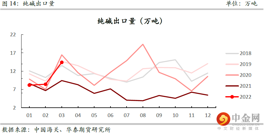 纯碱的进出口方面,随着国际能源价格的飞涨,直接推高了海外纯碱的生产成本,粗略估计因能源价格上涨导致的海外纯碱生产成本增加约1100元/吨。巨大的国内外价差刺激我国纯碱出口的增加,按照海关数据统计,今年一季度中国累计出口纯碱31万吨,同比增长25%,其中2月份中国纯碱出口8.44万吨,同比增长25.97%,3月份出口14.4万吨,同比增长52.9%,出口保持增长态势。
