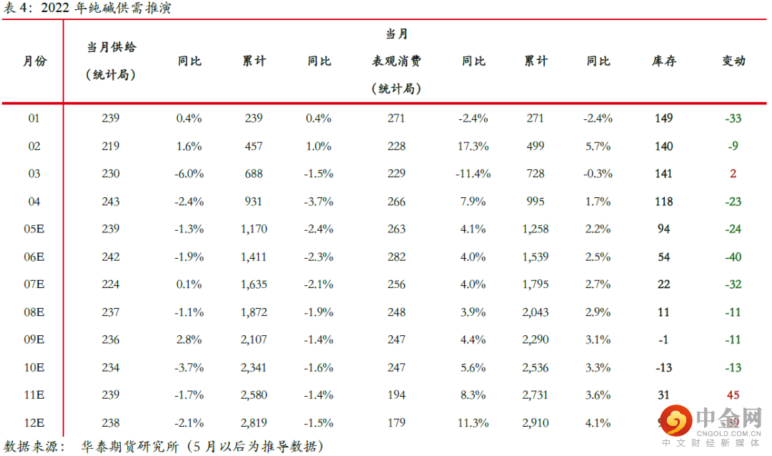 假设国内疫情或者封控措施能够在6月份有所好转,房地产行业能够在三季度回暖,我们推演的纯碱供需演化如下: