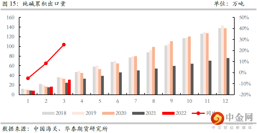 6、国际能源价格的飞涨,直接推高了海外纯碱的生产成本,刺激我国纯碱出口的增加,一季度中国累计出口纯碱31万吨,同比增长25%,出口持续保持增长态势。
