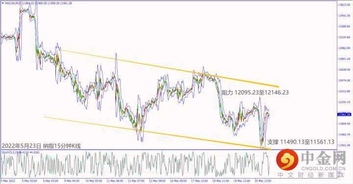 上周五(20日)欧洲央行官员称经济面临温和衰退,一度造成欧美股指皆出现大跌,尾盘扎空盘收复当日跌势。预期今天(23日)德国公布经济数据利淡,德指一旦跌破小时布林带中轨13,995,建议可偏空操作。预期今天欧央官员和英国央行行长讨论加息抑制通胀,纳指冲不过5日均线12,029,建议可偏空操作。