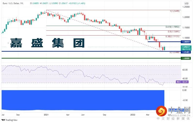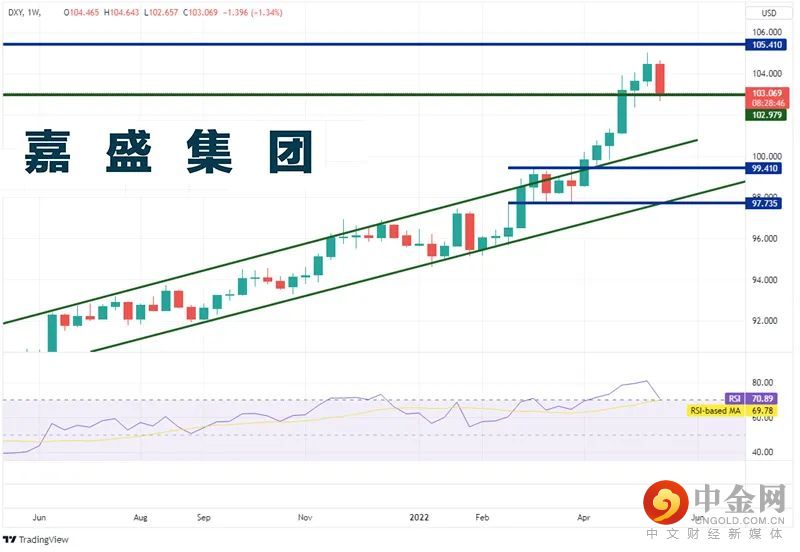 美元指数似乎给出了肯定的答案。一般而言,股指与美元反向波动。即,当股市下跌,美元倾向于上涨。但在周三标普500指数和纳斯达克100指数跌逾4%时,美元指数仅斩获0.5%的涨幅。是因为美元交易者担心经济增长放慢与滞胀吗?到了周四,股市再度收低时美元指数继续下跌,跌幅1%,且回到疫情期间高点102.98下方,周图似将走出6周中第一根阴线。