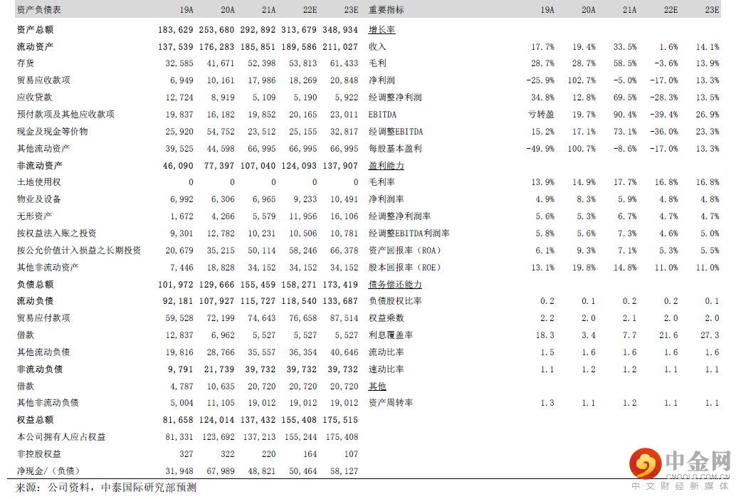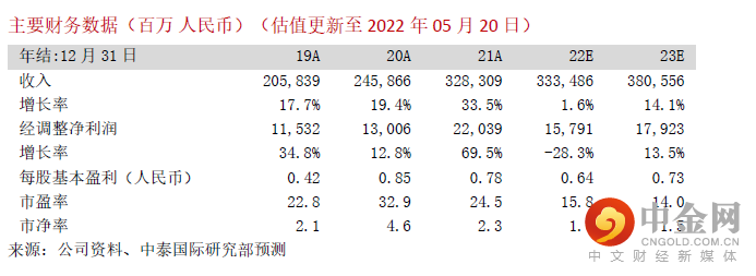 1Q22收入同比下降4.6%至人民币733.5亿元,主要受宏观经济环境、地缘形势、疫情、海外物流等因素影响;毛利率为17.3%,同比下降1.1个百分点,环比增加0.2个百分点;经调整净利润同比下降52.9%至人民币28.6亿元,基本符合彭博一致预期。
