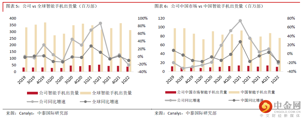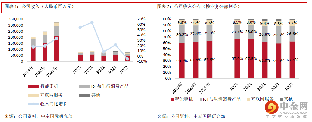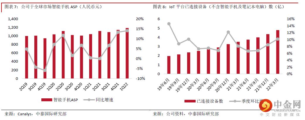 1Q22智能手机收入同比下降11.1%;出货量同比下降22.1%,排名保持全球第三,市占率为12.6%,同比下降1.5个百分点,环比提升0.1个百分点;受惠高端产品表现,ASP同比增加14.1%至1,188.5元。1Q22智能手机毛利率同比下降3个百分点至9.9%,主要由于公司为清库存对部分机型进行了促销。2Q22中国内地疫情反复,预期对中国消费需求及线下门店经营均有影响,智能手机销售短期仍存压力;考虑到宏观经济、地缘形势及疫情下物流因素,我们预期2Q22境外智能手机销售亦存压力。毛利率则会受到芯片供应紧张问题逐步缓解及促销季影响。但公司渠道竞争力持续提升,可支持长期增长。1Q22公司中国内地线下零售店增加约300家至10,500家,并已于21年10月开始与美团闪购启动试点合作,截至22年3月上线美团的小米之家门店已超3,000家,覆盖北上广深等276个城市。今年重点将为通过加强与运营商合作、扩大“销服一体”门店覆盖率、提升店员专业度、优化线下门店产品销售结构及提高IoT产品的销售连带率等方式提升门店店效。公司境外市场不断突破,于全球68个国家和地区智能手机出货量排名前五,较上季度增加6个;于38个境外运营商渠道中智能手机出货量排名前三,较上季度增加4个。