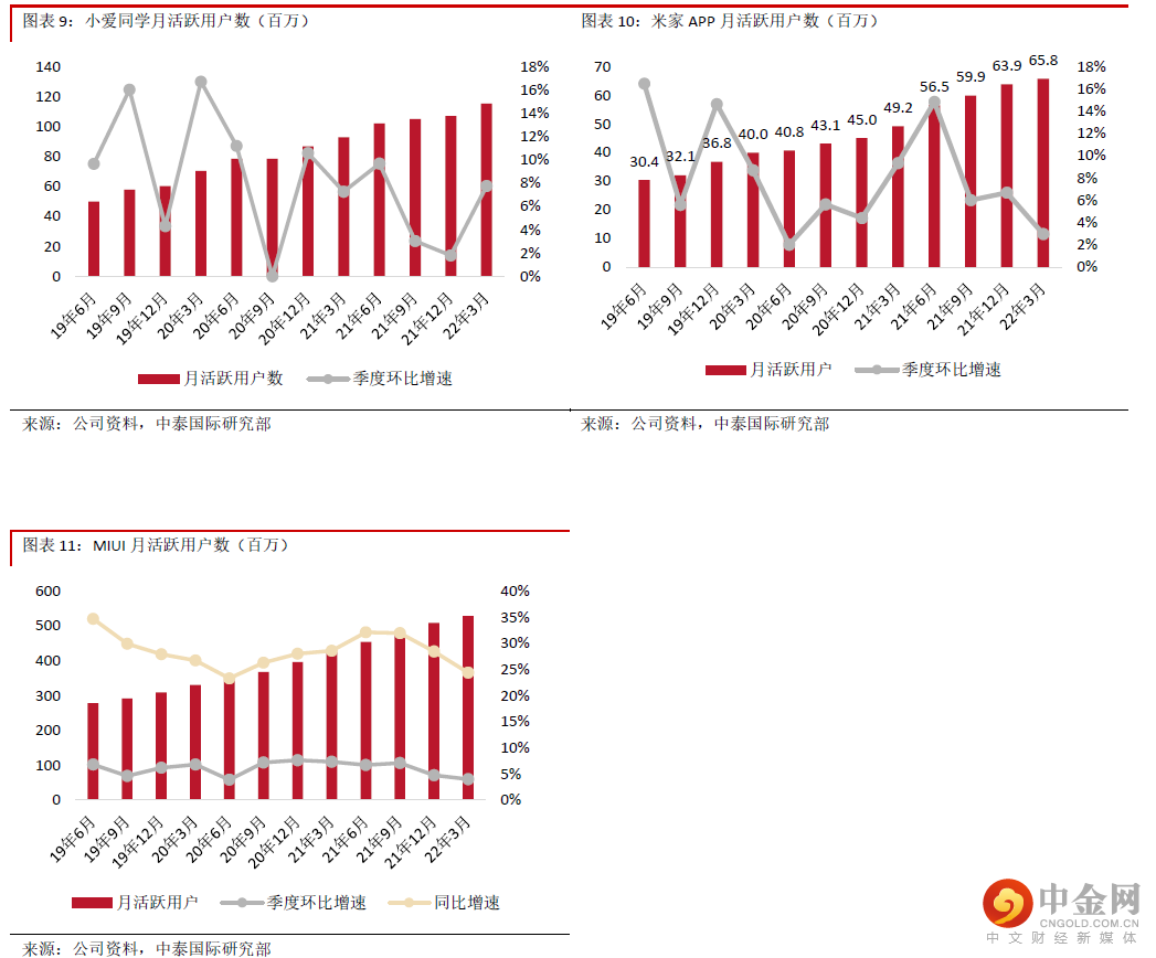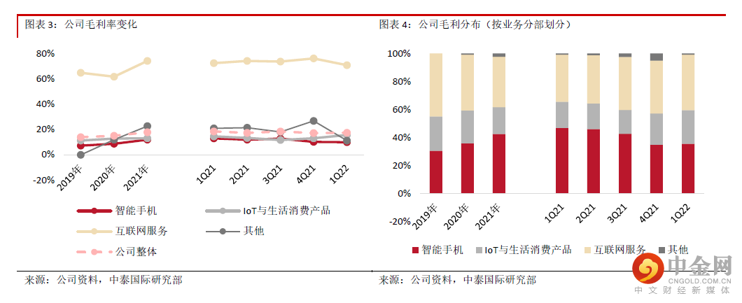互联网服务收入同比增长8.2%,增速放缓,主要受到智能手机出货量波动、中国内地广告和游戏行业监管环境变化的影响;其中,境外互联网服务收入同比大增71.1%,占比进一步提升至21.9%。互联网用户规模持续扩张,22年3月全球MIUI月活跃用户数同比增长24.4%至5.3亿,保持良好势头。互联网服务毛利率同比下降1.6个百分点至70.8%,主要由于部分毛利率较低的广告业务收入占比提升。鉴于宏观因素可能会影响广告主预算及用户互联网消费,以及手机销售疲软有机会影响短期用户增长,预期2Q22互联网服务增长仍存压力,或随着政策趋稳及经济复苏于下半年开始改善。