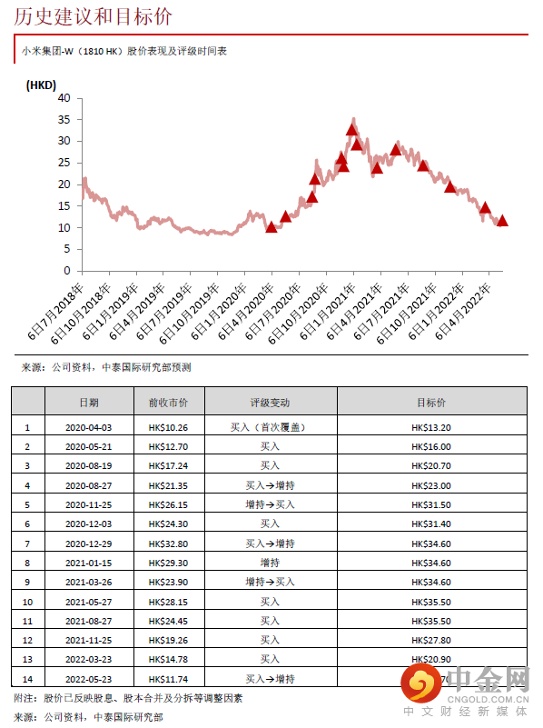 我们下调盈利预测以反映当前宏观及市场不确定性,包括疫情反复或影响智能手机需求及物流、芯片供应,恢复常态后竞争可能加剧、地缘形势及物流可能影响IoT海外销售、手机销售表现或对互联网业务增长造成影响以及智能电动车业务正处于投入期(1Q22智能电动汽车等创新业务费用约4.3亿元),预期22/23年经调整净利润分别为257.9/179.2亿元。考虑到短期业绩存在压力及较多不确定性,我们略降22年目标PE至18.5倍,相应下调目标价至13.70港元,潜在升幅为16.7%,下调至“增持”评级。