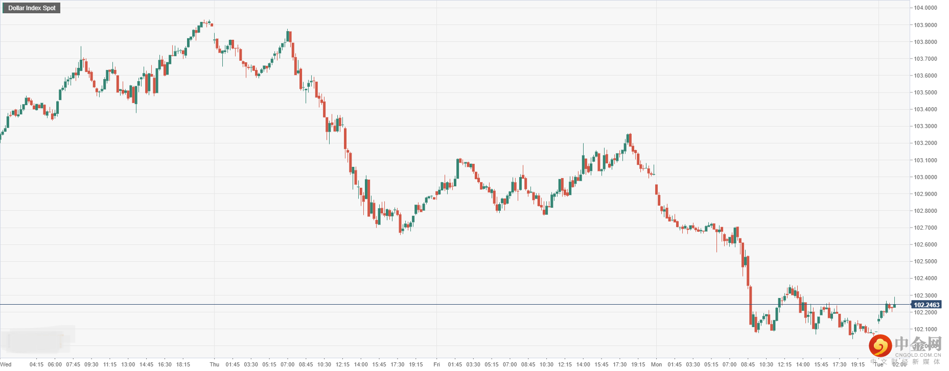 美元指数周一收盘大幅回落后,今日开盘跌0.87%至102.24附近,显然美元在上周遭抛售后继续全面下跌。