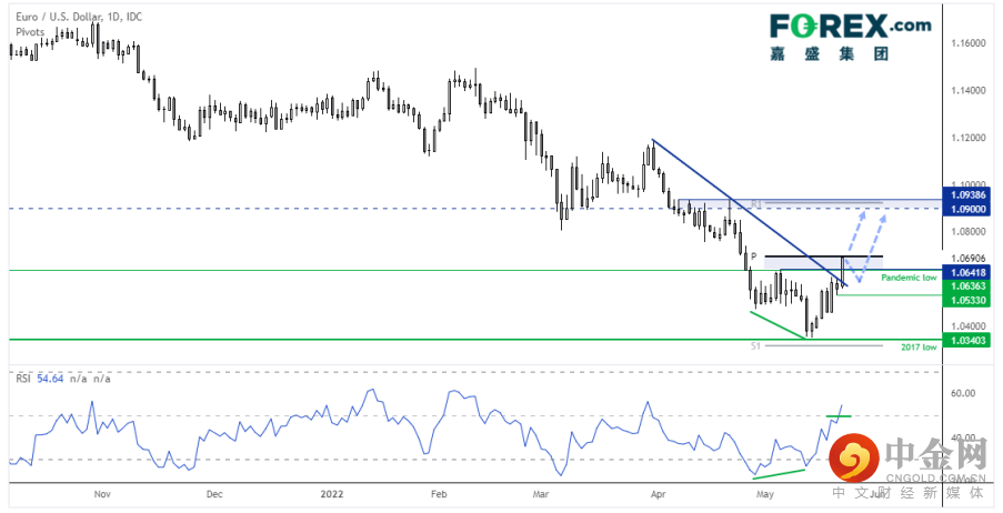 欧元/美元得到拉加德强硬言论与德国强劲的商业信心报告的帮助,涨至19天高点。日图价格在1.0340低点之上形成了看涨背离,自此之后收上疫情期间低点,RSI现在也高于50。但上档在月图枢轴点位遇阻,价格在继续上涨之前或先行回调。守住1.0530低点,我们继续看涨,目标站上1.0700,最终目标涨至1.0900附近。