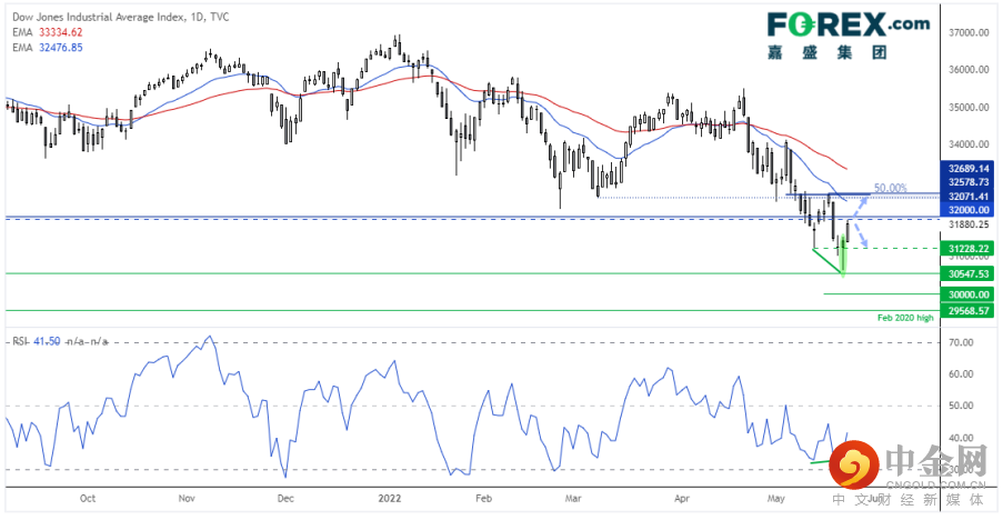 道指目前处于强而有力的下跌趋势中,但自1月创下历史高点以来的表现一直好于标普500指数和纳斯达克100指数。道指假突破31,228的同时与RSI形成看涨背离,后于上周五在30,548支撑位上方形成看涨锤子形态,昨天斩获13天最大单日涨幅,但止步于32,000阻力下方不远处。该位可能是今天的枢轴点位,如果站于其上,后市重点关注32,600,而若在该位附近形成任何反转形态,空头后市重点关注31,228低点。