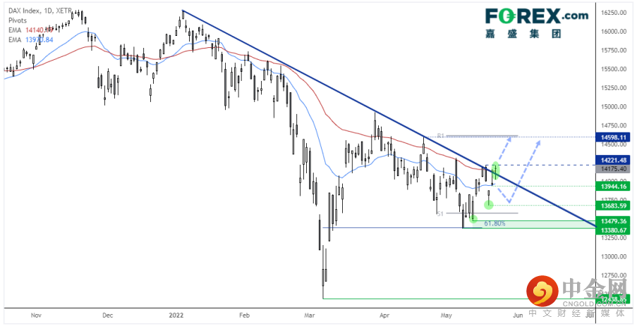 DAX 3月强力反弹,4月以来则似进入修正,一直未能攻克下降趋势线阻力。修正行情在61.8%回档位附近构筑低点,此后形成两个上抬的低点,现收上50天指数移动均线与下降趋势线。我们期待最终站上14,222,发出新一轮冲高的信号,上攻14,600。但若当前价位附近形成反转形态且接着下破13,940,则暗示在预期中的向上突破发生之前,可能展开新一轮跌势。