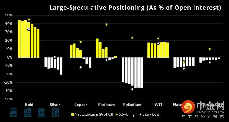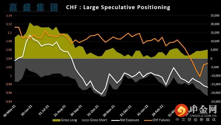 截至上周二,瑞郎期货净空头敞口处在逾六个月来最看跌水平。总空头触及17周高点,不过近几周总多头规模持续攀升。我们认为原因可能在瑞士央行。瑞士央行已向市场发出有能力(在合理范围内)应对本币走强的信号,并暗示,如果通胀继续超过预期,或终将上调-0.75%的政策利率下限。瑞士央行周四鹰派言论导致美元/瑞郎急挫,创近六年来最大单日跌幅。所以,瑞郎空头明显已于低点平仓出场,未来几周,随着瑞士央行最终被迫加息,这一走势很可能继续。