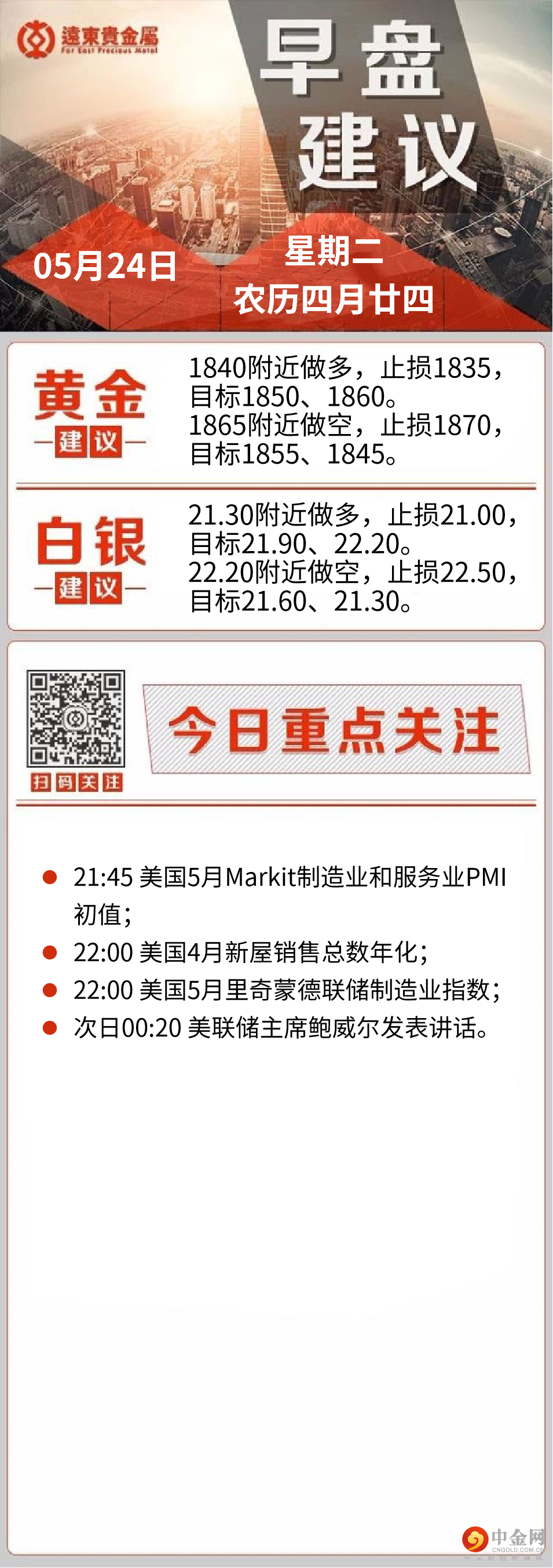 展望日内重点关注消息面,本交易日将迎来欧美多个国家5月PMI数据,需要留意市场对全球经济前景预期的变化。另外次日0:20,美联储主席鲍威尔在一场经济峰会上致欢迎词。鲍威尔上周二说,美联储将加息直到“通胀以明显且令人信服的方式下降”。这算是他迄今为止最鹰派的评论之一。此外,还需要留意俄乌地缘局势、新冠疫情相关消息。