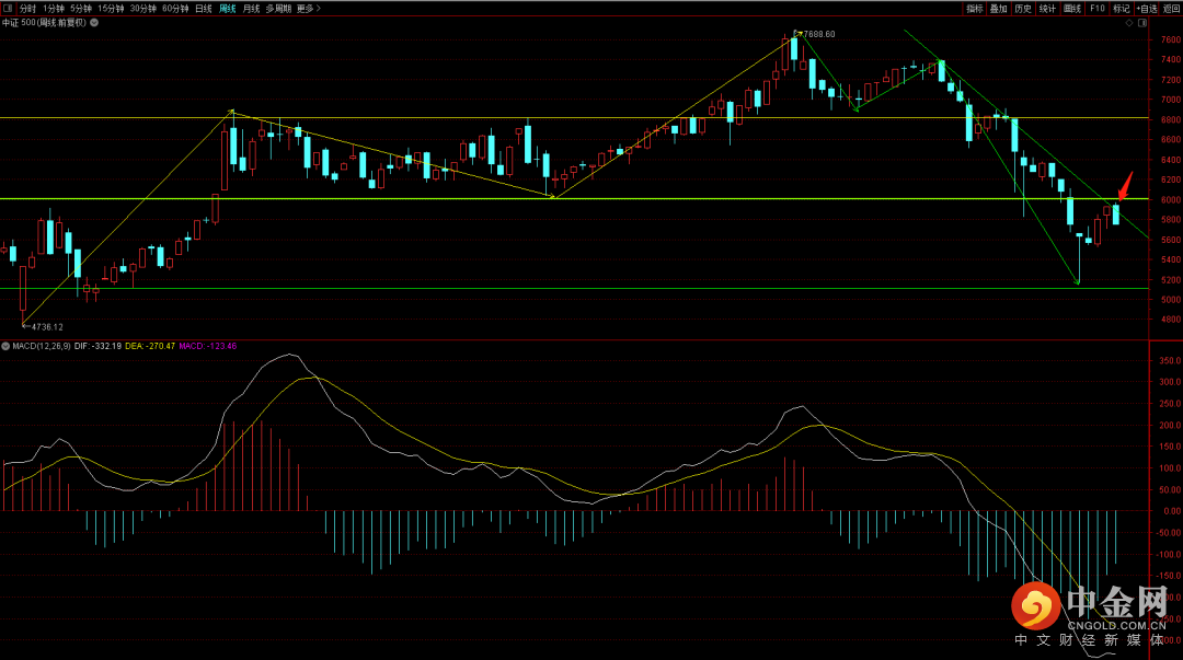 中证500在向上尝试突破周线下降趋势线失败,短期日线macd量柱出现敦化走势,后续如果再次向上无法同步上扬则代表这段日线反弹笔大概率可以终结了。注意耐心等待下一次的底分型结构出现。