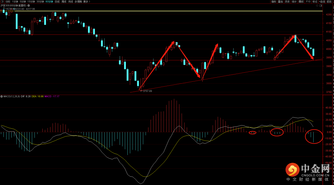 沪深300短期注意六十分钟的上升趋势支撑,如果出现跌破则有转弱的可能出现,届时将有再次向下试探下方前期低点的可能。