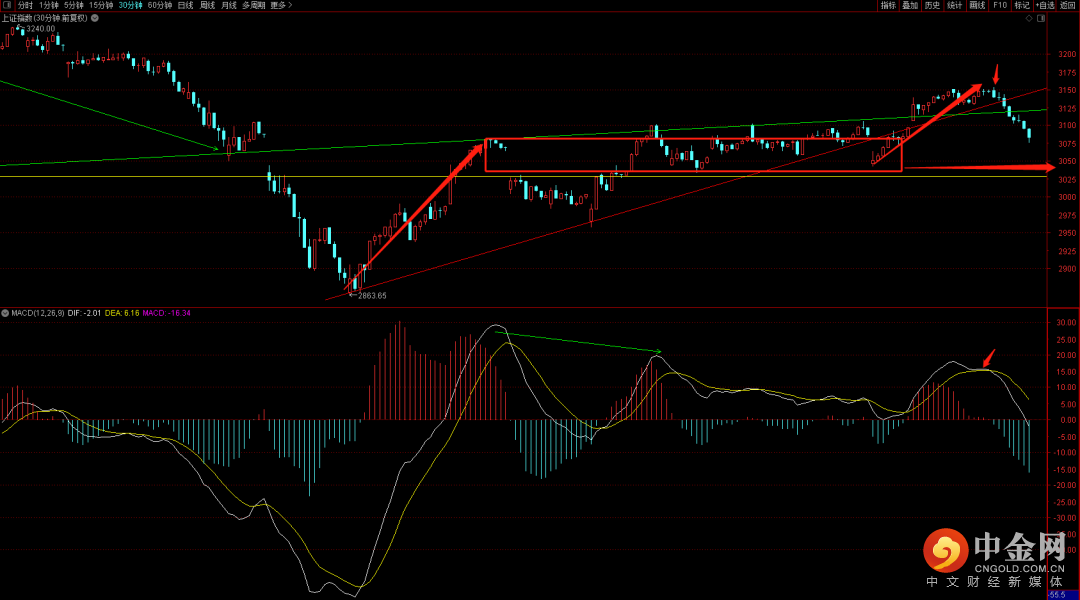 大盘出现三十分钟顶背驰结构后出现继续下跌,短期十五分钟有m头结构注意下方3025到350区间支撑,大概率在这个区间附近会出现企稳反弹结构,而后续反弹大概率在六十分钟会构筑二卖结构,注意把控好高抛节奏点。而时间周期的变盘点注意观察端午节前后。