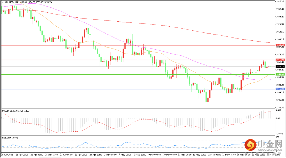 周一现货黄金延续涨势,日内最高触及1865.15美元/盎司,美盘时段回吐部分涨幅,最终收涨0.39%,报1853.59美元/盎司。本交易日国际金价持坚,因美元指数续创4月26日以来新低至101.73。鉴于美联储在6月和7月会议上各加息至少50个基点的预期已经被消化,投资者继续解除对美元进一步上涨的押注,有利于以美元计价的黄金。