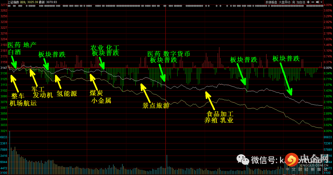 A股开盘三大指数涨跌不一,沪指高开0.07%,深成指低开0.16%,创指低开0.23%。整车、水利、家电等板块高开领先,农业、小金属板块低开较多。开盘后整车、汽车零件、机场航运等板块拉升,但新冠治疗、医药、白酒、地产等板块下跌,指数开盘震荡。9点45国防军工、航空发动机板块拉升,10点多数板块走低,三大指数集体翻绿。氢能源、天然气板块逆市上涨。10点半农业、化工等板块普跌,11点过后景点旅游板块反弹。午后开盘市场惯性下跌,1点半食品加工、养殖业反弹。2点板块普跌,2点半市场继续下跌,创指跌超3%,沪指跌超2%。指数收盘在全日低点,沪指收跌2.41%,深成指跌3.34%,创指跌3.82%。两市几乎全线下跌,红盘家数不足300家,涨停个股47家,跌停个股69家。