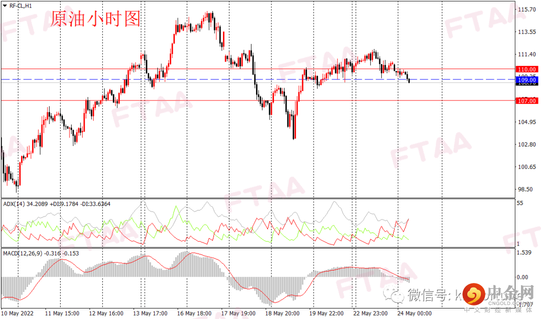 原油周一冲高回落震荡,最高111.87,最低109.13,日图收出上影小阴,显示上方稍有阻力,但日图级别维持震荡略偏多。美国提出要动用紧急柴油储备,同时欧盟重提对俄石油禁运。油价昨日亚欧盘震荡上行,美盘时段回落。当前MACD指标接近翻绿,短线或延续震荡调整。今早亚盘油价持续下行,操作上可平出多单,转为观望,或逢高在109附近轻仓空,止损110,目标107。