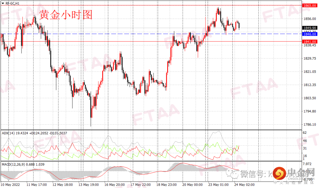 黄金期货周一冲高回落,最高1863.75,最低1844.40,日图收出长上影小阳,显示多头继续占优,但上影线显示1865附近阻力较为明显。小时图看,昨日亚欧盘冲高后,美盘早盘回落。当前ADX指标和MACD指标均回落至低位,今早亚盘金价维持震荡,短线震荡或延续。操作上可观望,或逢低在1846附近轻仓多,止损1841,目标1865。