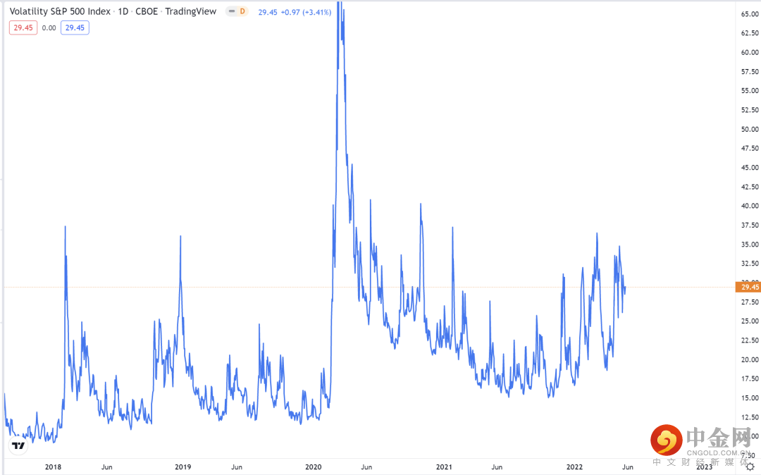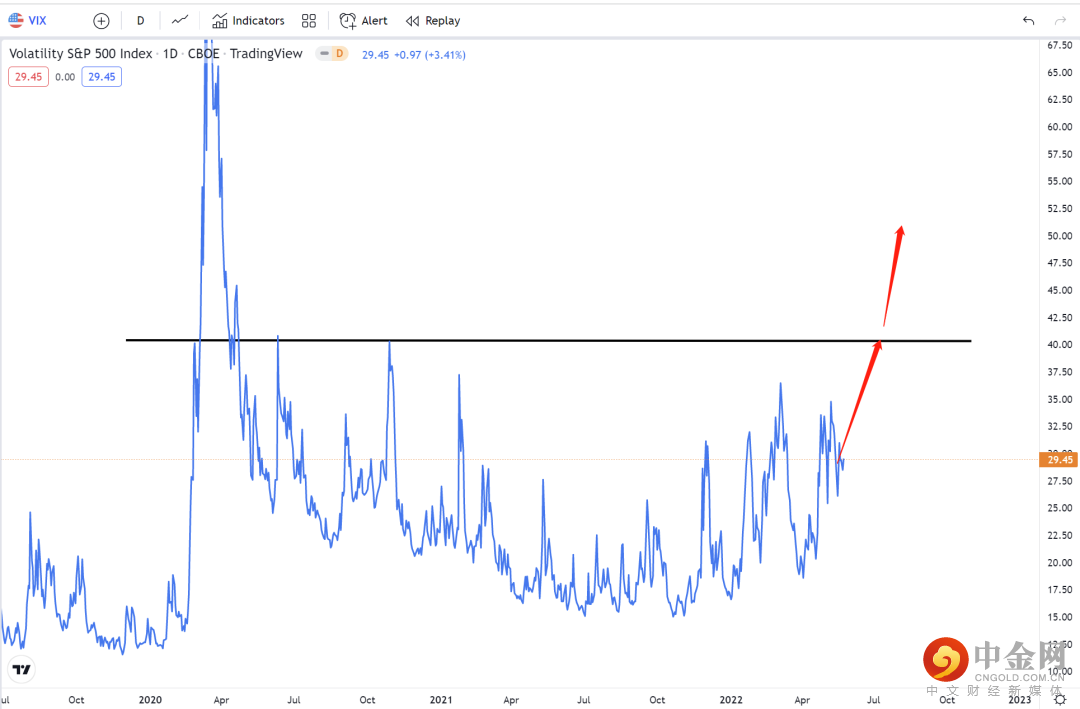 而从目前的市场情绪来看,由于纳斯达克指数从今年1月高点16600附近一路下跌,下跌幅度也超30%,标普500指数自4800点下跌超20%,这样的回撤幅度看似足够。而现在仍有乐观的投资者认为美国经济衰退的局面略显悲观。从VIX指数来看,当前处在29.45,目前正处于蓄势待发的局面。