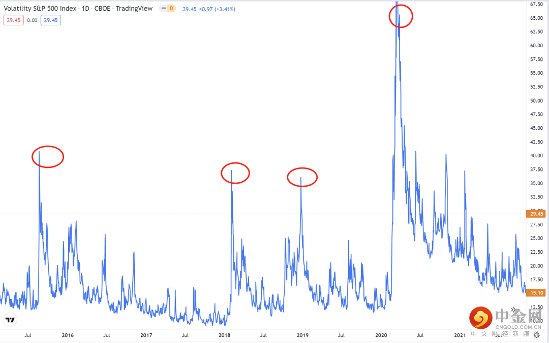图中红圈部分均为VIX指数远高于水平线的时期,从右往左的时间节点依次是2020年3月,2018年12月,2018年2月,2015年8月。