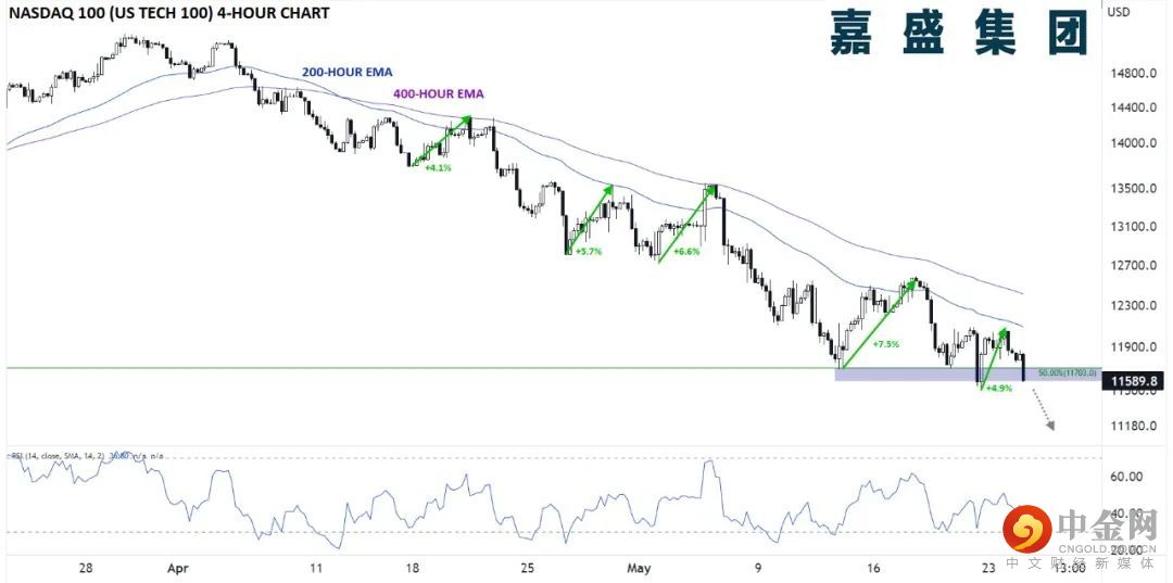 过去6周里,该股指400小时指数移动均线(4小时图上的100期指数移动均线)始终压制了这次反弹。此文发稿时,纳斯达克100指数再度面临下破至新低的风险,空头下看上周低点11,500区域。如果攻克,下方没有重要支撑位,直至2020年11月低点11,000附近。