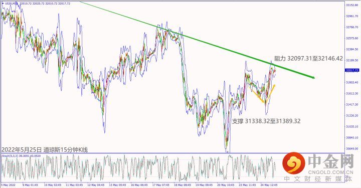 昨天(24日)欧美公布经济数据利淡,一度造成欧美股指下跌逾1%,晚间美股出现扎空盘收复当日跌势。预期今天(25日)欧元区公布经济数据大都不佳,德指若掼破60日均线14,026,建议可偏空操作。预期周四(26日)清晨美联储货币会议纪要重申加快加息,道琼斯一旦跌破小时布林带中轨31,907,建议可偏空操作。