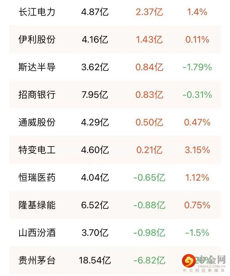 北向资金5月25日全天净买入34.09亿元,其中沪股通净买入20.45亿元,深股通净买入13.65亿元。长江电力、赣锋锂业、中矿资源分别获净买入2.37亿元、1.72亿元、1.69亿元。贵州茅台净卖出额居首,金额为6.82亿元。