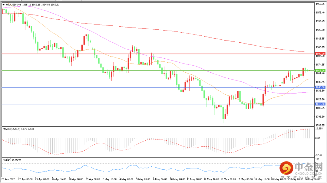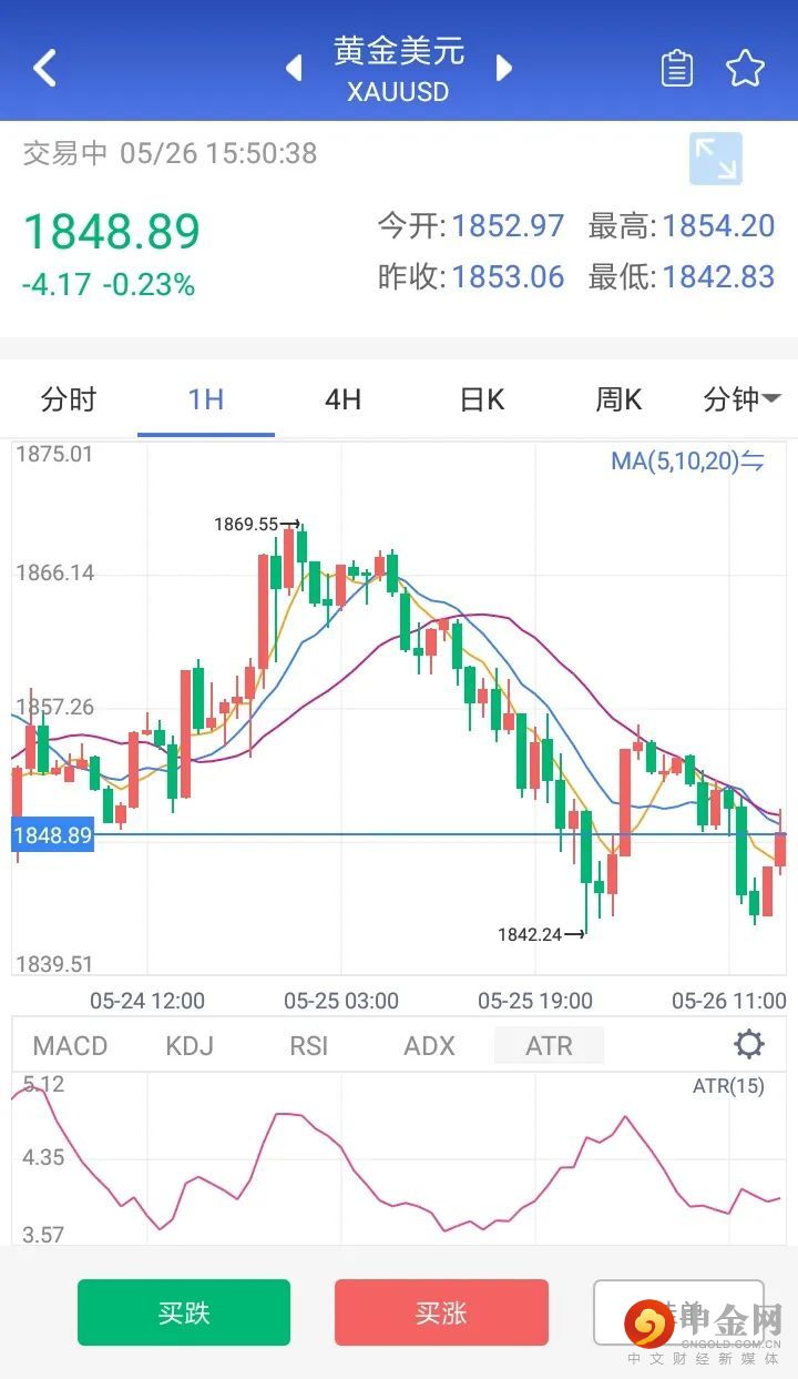 周三现货黄金遇阻回落重启跌势,美联储会议纪要公布之前,金价一度下破1850美元关口,跌超20美元,美联储会议纪要公布后短线走高,收窄日内跌幅,最终收跌0.67%。本交易日亚市盘中,国际黄金走势偏弱震荡,金价早间开盘价格1852美元,最高涨至1854美元,最低跌至1842美元,此后开始向上反弹,目前暂时交投于1849美元附近。