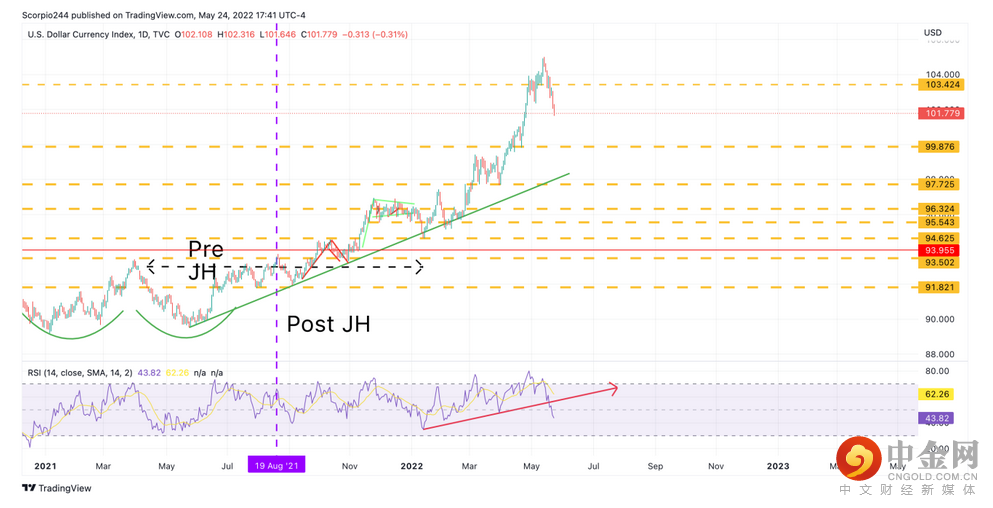 这一预期也开始反映在美元指数之中,虽然美元指数可能是短期的回调,不过你可以观察到相对强弱指数RSI已经跌破了趋势线,这可能预示着动能的重要转向。