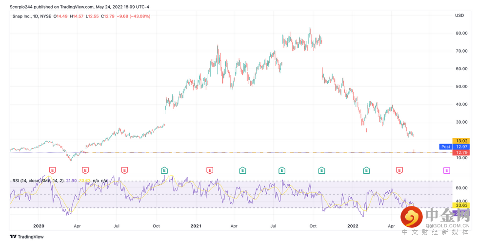 Snap公司的股价今天下跌了43%,并且成功填补了13美元附近的缺口。好消息是,Snap公司股票接下来没有需要填补的缺口了。