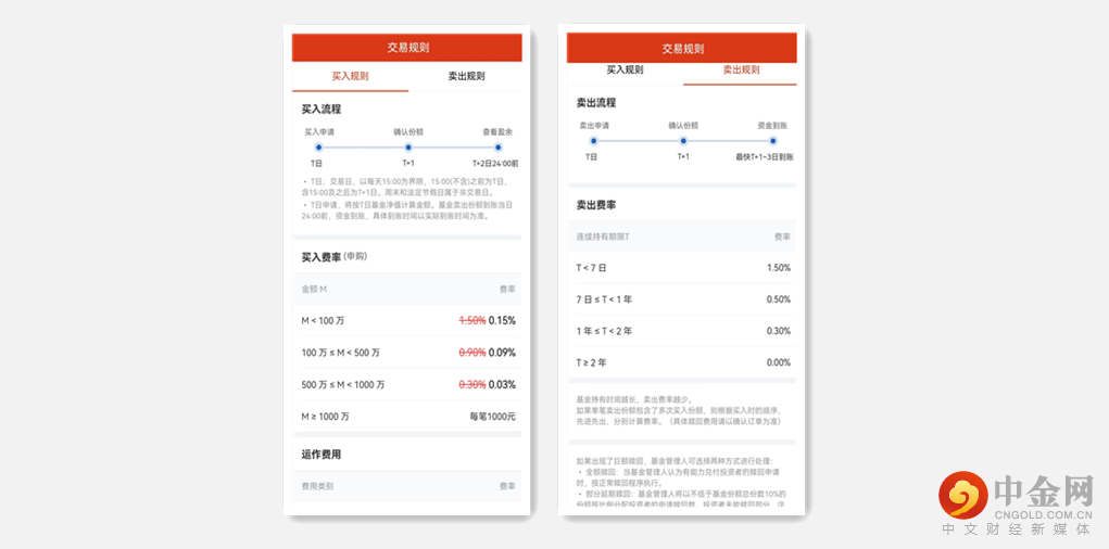 交易规则直观展示买入卖出流程、预估日期规则和交易费率,帮助投资者理性投资。