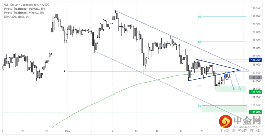 美元/日元确如我们昨天所指出的那样逆势反弹,上攻月图中枢点位。我们现在密切留意下跌潜力。200期和20期指数移动均线以及下降三角形的趋势线附近构成阻力,并且价格在4小时图上形成了看跌内包K线。受制于上图黑色线所示的月图中枢点位,我们看跌该货币对,下档目标包括周图第一支撑中枢和三角形突破目标126.30。